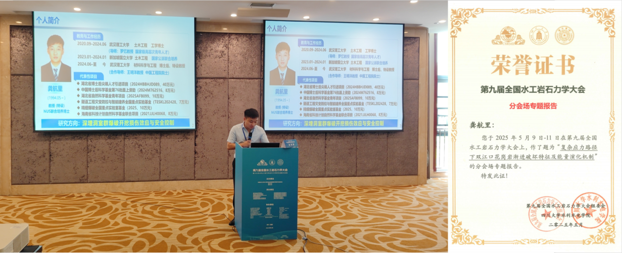大会期间,龚航里博士应邀作专题学术报告,重点分享了课题组近年来在大渡河双江口水电站地下厂房爆破开挖过程中围岩损伤效应与稳定性控制方面的研究进展与工程应用成效。报告内容紧扣工程实际,理论分析深入、技术体系完善,获得与会专家的高度评价与广泛关注。